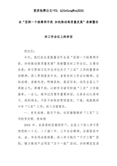 【七哥公文】2025年:在“坚持一个统筹两手抓 加快推动高质量发展”表彰暨农村工作会议上的讲话+更多免费公文+VX:QiGeGongWen2024+更多免费公文+VX:QiGeGongWen2024