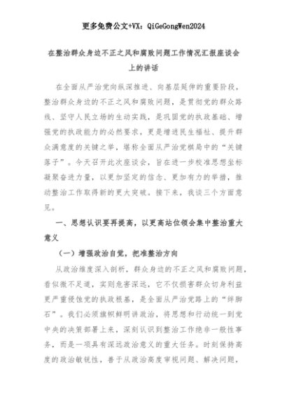 【七哥公文】2025年:在整治群众身边不正之风和腐败问题工作情况汇报座谈会上的讲话+更多免费公文+VX:QiGeGongWen2024+更多免费公文+VX:QiGeGongWen2024