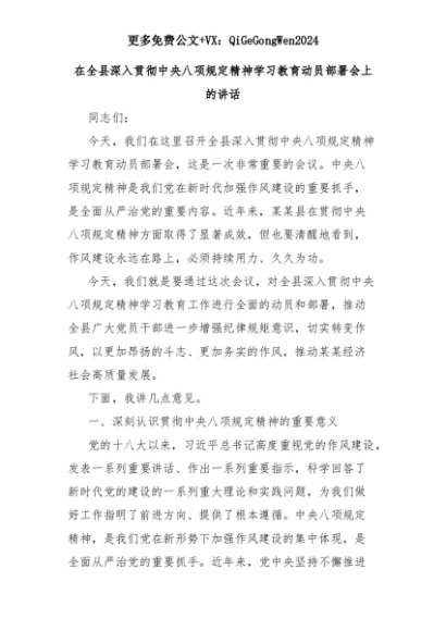 【七哥公文】2025年:在全县深入贯彻中央八项规定精神学习教育动员部署会上的讲话+更多免费公文+VX:QiGeGongWen2024+更多免费公文+VX:QiGeGongWen2024