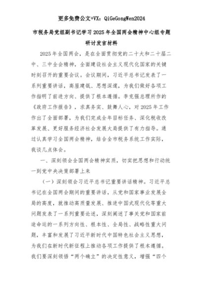 【七哥公文】2025年:市税务局党组副书记学习2025年全国两会精神中心组专题研讨发言材料+更多免费公文+VX:QiGeGongWen2024+更多免费公文+VX:QiGeGongWen2024