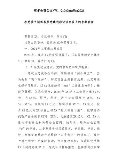 【七哥公文】2025年:在党委书记抓基层党建述职评议会议上的表率发言+更多免费公文+VX:QiGeGongWen2024+更多免费公文+VX:QiGeGongWen2024