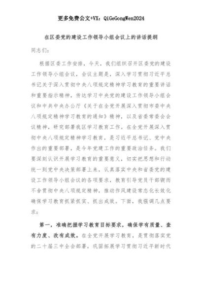 【七哥公文】2025年:在区委党的建设工作领导小组会议上的讲话提纲+更多免费公文+VX:QiGeGongWen2024+更多免费公文+VX:QiGeGongWen2024