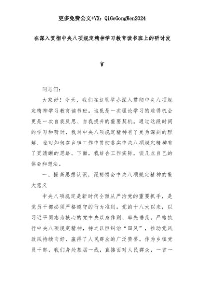 【七哥公文】2025年:在深入贯彻中央八项规定精神学习教育读书班上的研讨发言+更多免费公文+VX:QiGeGongWen2024+更多免费公文+VX:QiGeGongWen2024
