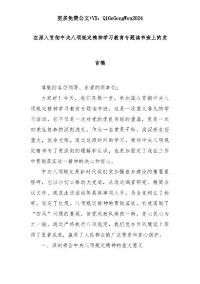 【七哥公文】2025年:在深入贯彻中央八项规定精神学习教育专题读书班上的发言稿+更多免费公文+VX:QiGeGongWen2024+更多免费公文+VX:QiGeGongWen2024