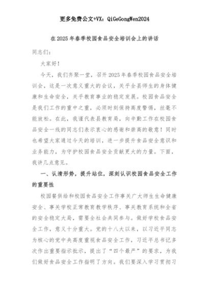 【七哥公文】2025年:在2025年春季校园食品安全培训会上的讲话+更多免费公文+VX:QiGeGongWen2024+更多免费公文+VX:QiGeGongWen2024