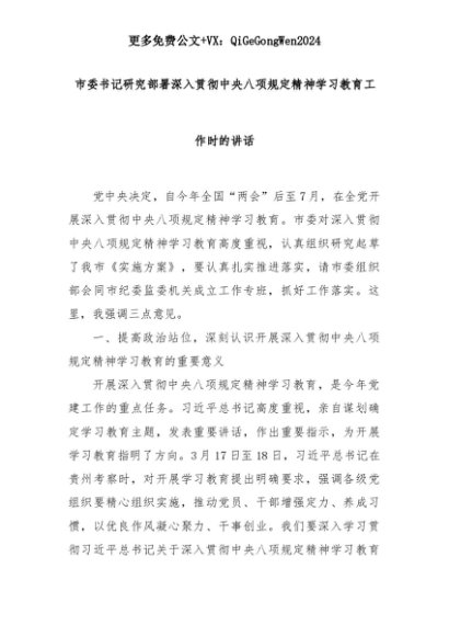 【七哥公文】2025年:市委书记研究部署深入贯彻中央八项规定精神学习教育工作时的讲话+更多免费公文+VX:QiGeGongWen2024+更多免费公文+VX:QiGeGongWen2024