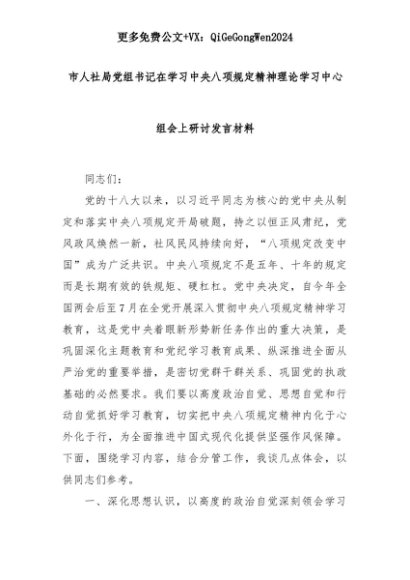 【七哥公文】2025年:市人社局党组书记在学习中央八项规定精神理论学习中心组会上研讨发言材料+更多免费公文+VX:QiGeGongWen2024+更多免费公文+VX:QiGeGongWen2024