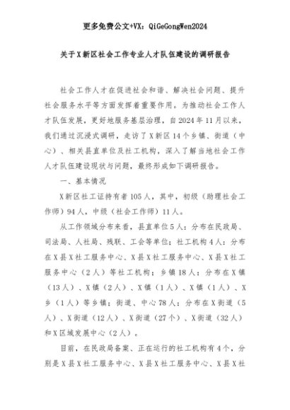 【七哥公文】2025年:关于X新区社会工作专业人才队伍建设的调研报告+更多免费公文+VX:QiGeGongWen2024+更多免费公文+VX:QiGeGongWen2024