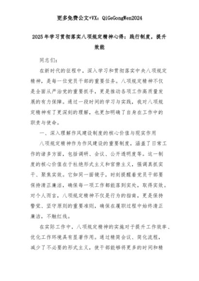 【七哥公文】2025年:2025年学习贯彻落实八项规定精神心得:践行制度,提升效能+更多免费公文+VX:QiGeGongWen2024+更多免费公文+VX:QiGeGongWen2024