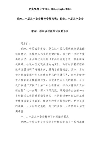 【七哥公文】2025年:党的二十届三中全会精神专题党课:贯彻二十届三中全会精神,推动乡村振兴迈向新台阶+更多免费公文+VX:QiGeGongWen2024+更多免费公文+VX:QiGeGongWen2024