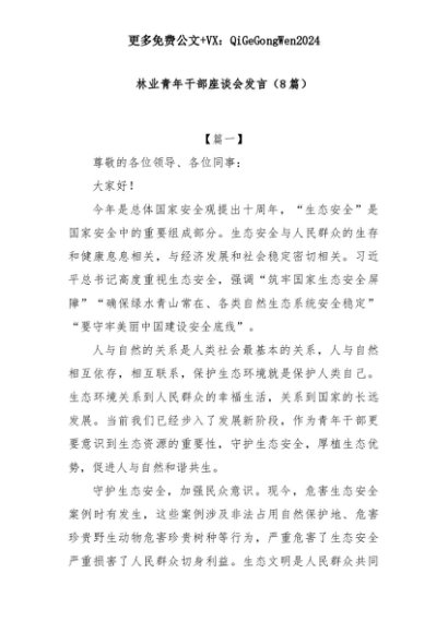【七哥公文】2025年:(8篇)林业青年干部座谈会发言+更多免费公文+VX:QiGeGongWen2024+更多免费公文+VX:QiGeGongWen2024