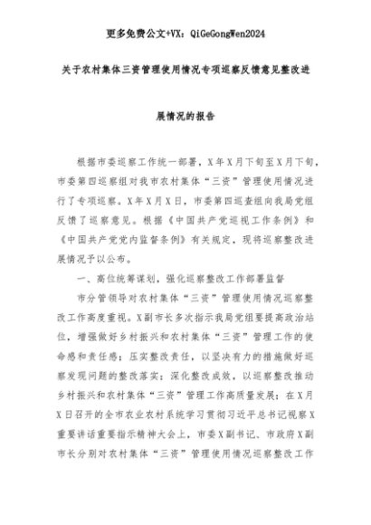 【七哥公文】2025年:关于农村集体三资管理使用情况专项巡察反馈意见整改进展情况的报告+更多免费公文+VX:QiGeGongWen2024+更多免费公文+VX:QiGeGongWen2024