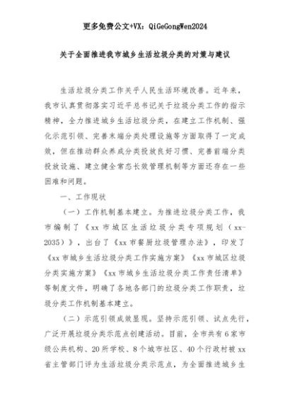 【七哥公文】2025年:关于全面推进我市城乡生活垃圾分类的对策与建议+更多免费公文+VX:QiGeGongWen2024+更多免费公文+VX:QiGeGongWen2024