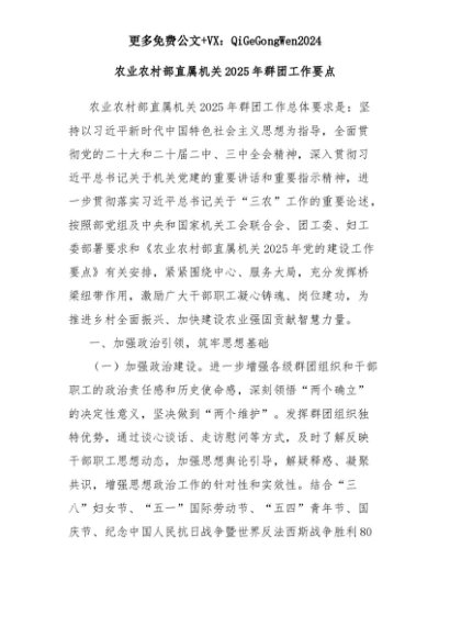 【七哥公文】2025年:农业农村部直属机关2025年群团工作要点+更多免费公文+VX:QiGeGongWen2024+更多免费公文+VX:QiGeGongWen2024