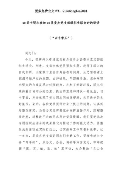 【七哥公文】2025年:xx委书记在参加xx县委办党支部组织生活会时的讲话(“四个带头”)+更多免费公文+VX:QiGeGongWen2024+更多免费公文+VX:QiGeGongWen2024