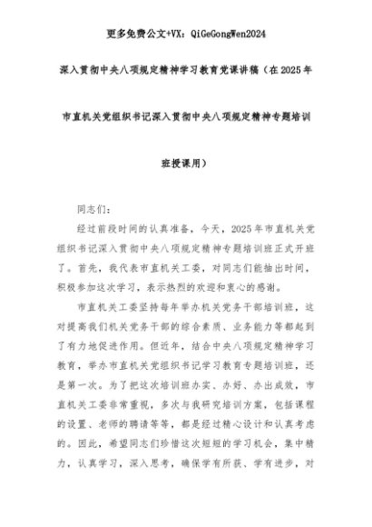 【七哥公文】2025年:深入贯彻中央八项规定精神学习教育党课讲稿(在2025年市直机关党组织书记深入贯彻中央八项规定精神专题培训班授课用)+更多免费公文+VX:QiGeGongWen2024+更多免费公文+VX:QiGeGongWen2024
