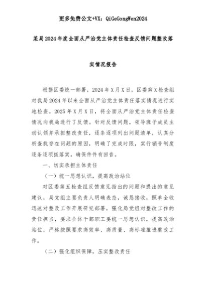【七哥公文】2025年:某局2024年度全面从严治党主体责任检查反馈问题整改落实情况报告+更多免费公文+VX:QiGeGongWen2024+更多免费公文+VX:QiGeGongWen2024
