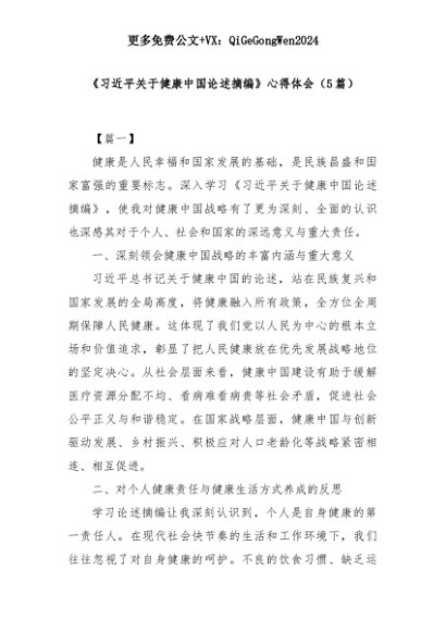 【七哥公文】2025年:(5篇)《习近平关于健康中国论述摘编》心得体会+更多免费公文+VX:QiGeGongWen2024+更多免费公文+VX:QiGeGongWen2024