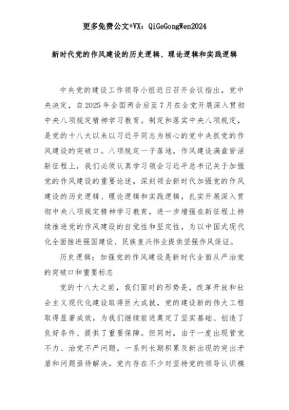 【七哥公文】2025年:新时代党的作风建设的历史逻辑、理论逻辑和实践逻辑+更多免费公文+VX:QiGeGongWen2024+更多免费公文+VX:QiGeGongWen2024