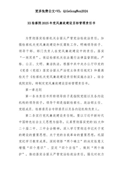 【七哥公文】2025年:XX检察院2025年党风廉政建设目标管理责任书+更多免费公文+VX:QiGeGongWen2024+更多免费公文+VX:QiGeGongWen2024
