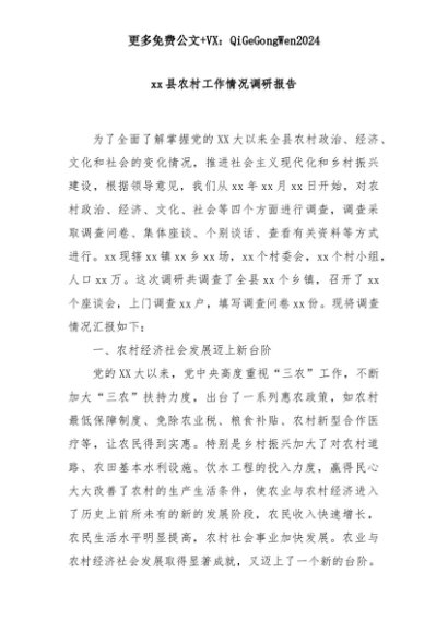 【七哥公文】2025年:xx县农村工作情况调研报告+更多免费公文+VX:QiGeGongWen2024+更多免费公文+VX:QiGeGongWen2024