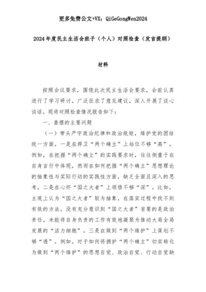 【七哥公文】2025年:2024年度民主生活会班子(个人)对照检查(发言提纲)材料+更多免费公文+VX:QiGeGongWen2024+更多免费公文+VX:QiGeGongWen2024