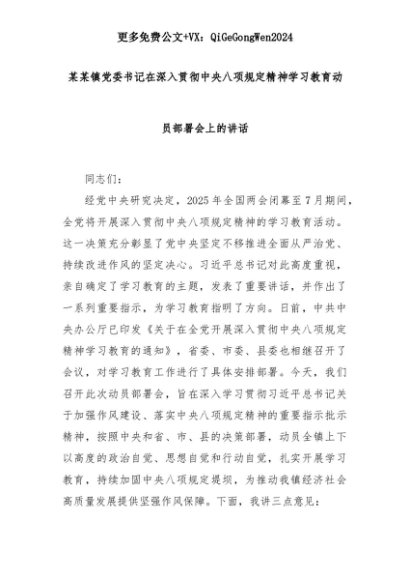 【七哥公文】2025年:某某镇党委书记在深入贯彻中央八项规定精神学习教育动员部署会上的讲话+更多免费公文+VX:QiGeGongWen2024+更多免费公文+VX:QiGeGongWen2024