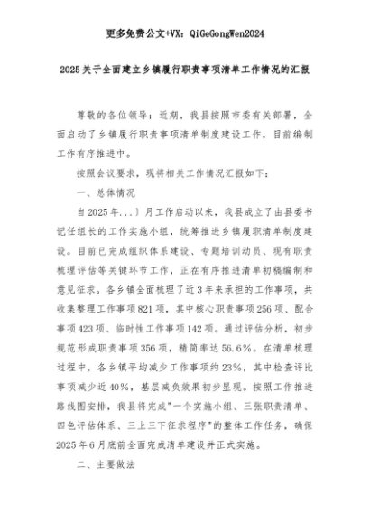 【七哥公文】2025年:2025关于全面建立乡镇履行职责事项清单工作情况的汇报+更多免费公文+VX:QiGeGongWen2024+更多免费公文+VX:QiGeGongWen2024