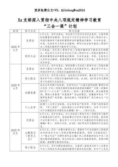 【七哥公文】2025年:××支部深入贯彻中央八项规定精神学习教育“三会一课”计划+更多免费公文+VX:QiGeGongWen2024+更多免费公文+VX:QiGeGongWen2024