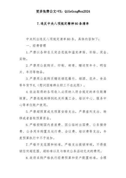 【七哥公文】2025年:7.违反中央八项规定精神80条清单+更多免费公文+VX:QiGeGongWen2024+更多免费公文+VX:QiGeGongWen2024