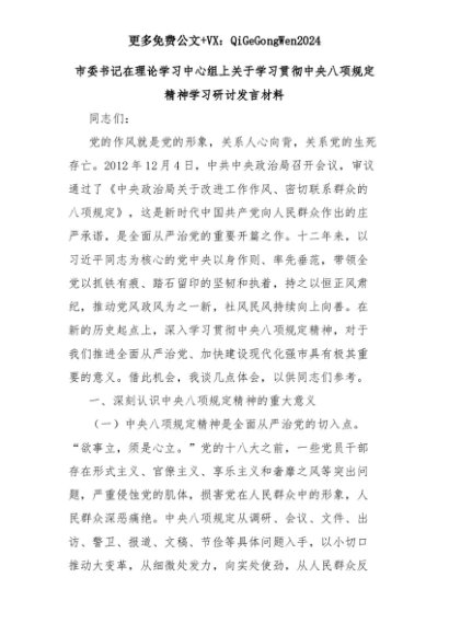 【七哥公文】2025年:市委书记在理论学习中心组上关于学习贯彻中央八项规定精神学习研讨发言材料+更多免费公文+VX:QiGeGongWen2024+更多免费公文+VX:QiGeGongWen2024