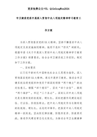 【七哥公文】2025年:市卫健委党委开展深入贯彻中央八项规定精神学习教育工作方案+更多免费公文+VX:QiGeGongWen2024+更多免费公文+VX:QiGeGongWen2024