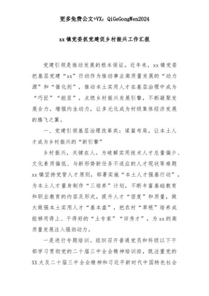 【七哥公文】2025年:xx镇党委抓党建促乡村振兴工作汇报+更多免费公文+VX:QiGeGongWen2024+更多免费公文+VX:QiGeGongWen2024