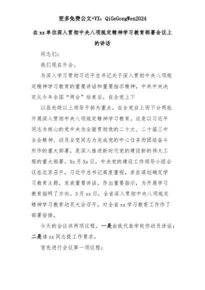 【七哥公文】2025年:在单位深入贯彻中央八项规定精神学习教育部署会议上的讲话+更多免费公文+VX:QiGeGongWen2024+更多免费公文+VX:QiGeGongWen2024