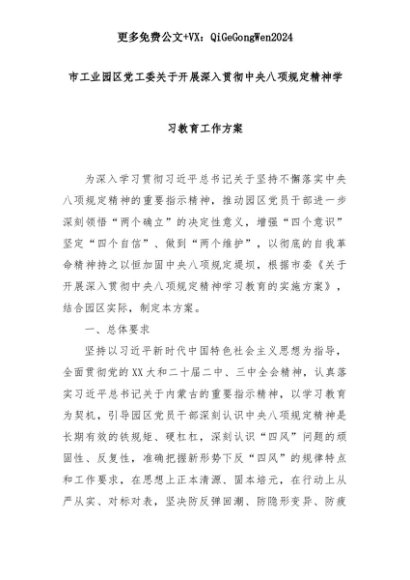 【七哥公文】2025年:市工业园区党工委关于开展深入贯彻中央八项规定精神学习教育工作方案+更多免费公文+VX:QiGeGongWen2024+更多免费公文+VX:QiGeGongWen2024