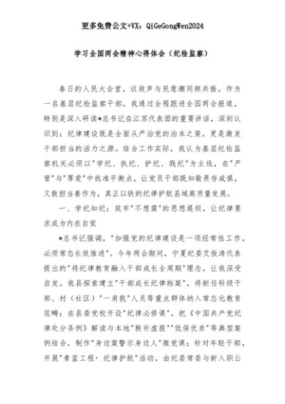 【七哥公文】2025年:学习全国两会精神心得体会(纪检监察)+更多免费公文+VX:QiGeGongWen2024+更多免费公文+VX:QiGeGongWen2024