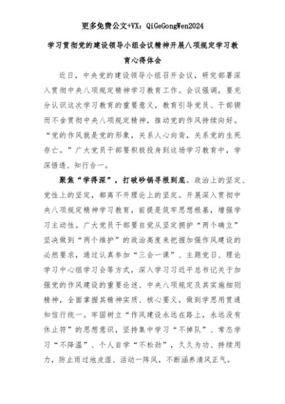 【七哥公文】2025年:学习贯彻党的建设领导小组会议精神开展八项规定学习教育心得体会+更多免费公文+VX:QiGeGongWen2024+更多免费公文+VX:QiGeGongWen2024