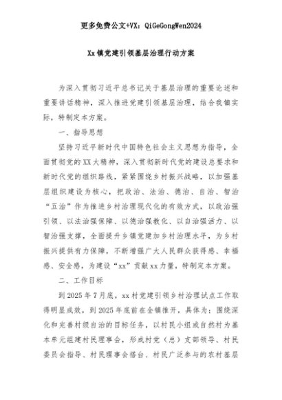 【七哥公文】2025年:Xx镇党建引领基层治理行动方案+更多免费公文+VX:QiGeGongWen2024+更多免费公文+VX:QiGeGongWen2024
