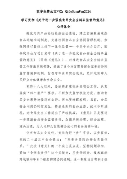 【七哥公文】2025年:学习贯彻《关于进一步强化食品安全全链条监管的意见》心得体会+更多免费公文+VX:QiGeGongWen2024+更多免费公文+VX:QiGeGongWen2024