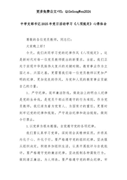 【七哥公文】2025年:中学支部书记2025年党日活动学习《八项规定》心得体会+更多免费公文+VX:QiGeGongWen2024+更多免费公文+VX:QiGeGongWen2024