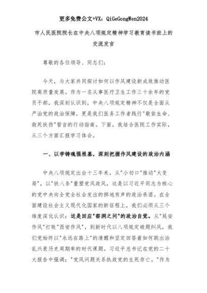 【七哥公文】2025年:市人民医院院长在中央八项规定精神学习教育读书班上的交流发言+更多免费公文+VX:QiGeGongWen2024+更多免费公文+VX:QiGeGongWen2024