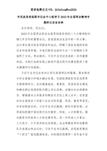 【七哥公文】2025年:市民政局党组副书记在中心组学习2025年全国两会精神专题研讨发言材料+更多免费公文+VX:QiGeGongWen2024+更多免费公文+VX:QiGeGongWen2024