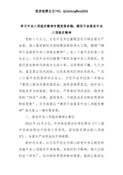 【七哥公文】2025年:学习中央八项规定精神专题党课讲稿:锲而不舍落实中央八项规定精神+更多免费公文+VX:QiGeGongWen2024+更多免费公文+VX:QiGeGongWen2024