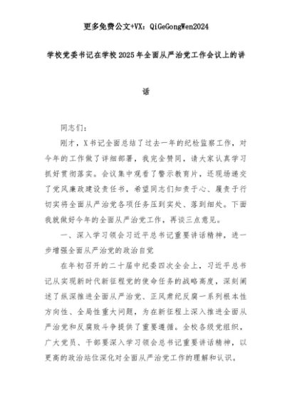 【七哥公文】2025年:学校党委书记在学校2025年全面从严治党工作会议上的讲话+更多免费公文+VX:QiGeGongWen2024+更多免费公文+VX:QiGeGongWen2024