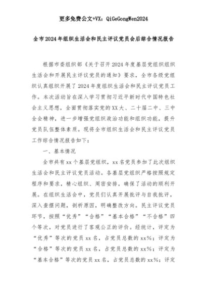 【七哥公文】2025年:全市2024年组织生活会和民主评议党员会后综合情况报告+更多免费公文+VX:QiGeGongWen2024+更多免费公文+VX:QiGeGongWen2024