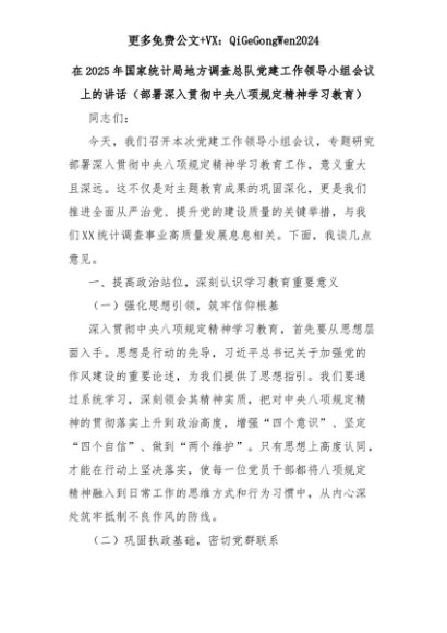 【七哥公文】2025年:在2025年国家统计局地方调查总队党建工作领导小组会议上的讲话(部署深入贯彻中央八项规定精神学习教育)+更多免费公文+VX:QiGeGongWen2024+更多免费公文+VX:QiGeGongWen2024