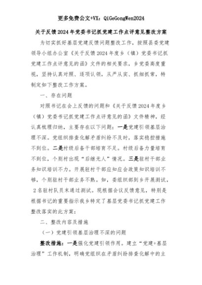 【七哥公文】2025年:关于反馈2024年党委书记抓党建工作点评意见整改方案+更多免费公文+VX:QiGeGongWen2024+更多免费公文+VX:QiGeGongWen2024