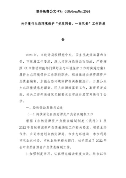【七哥公文】2025年:关于履行生态环境保护“党政同责、一岗双责”工作的报告+更多免费公文+VX:QiGeGongWen2024+更多免费公文+VX:QiGeGongWen2024
