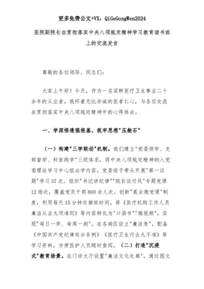 【七哥公文】2025年:医院副院长在贯彻落实中央八项规定精神学习教育读书班上的交流发言+更多免费公文+VX:QiGeGongWen2024+更多免费公文+VX:QiGeGongWen2024