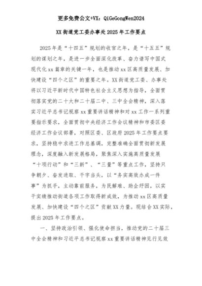 【七哥公文】2025年:XX街道党工委办事处2025年工作要点+更多免费公文+VX:QiGeGongWen2024+更多免费公文+VX:QiGeGongWen2024